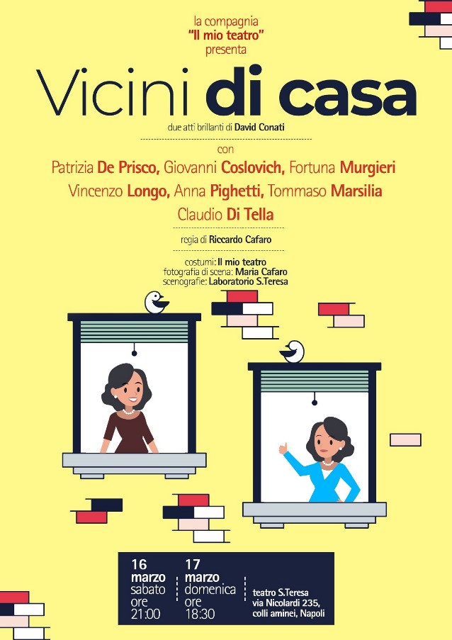 NAPOLI – Già protagonista, come attore, di numerosi spettacoli, debutta, sabato 16 marzo 2019 alle ore 21.00 e domenica 17 marzo alle ore 18.30 al teatro S. Teresa sito in Via Nicolardi a Napoli (Colli Aminei), il regista partenopeo Riccardo CAFARO, e lo fa con una divertente e non banale commedia, dal titolo “I VICINI DI CASA”.