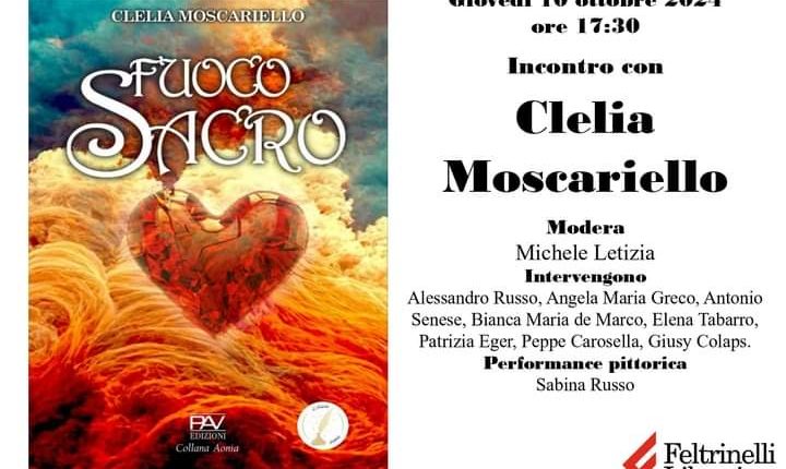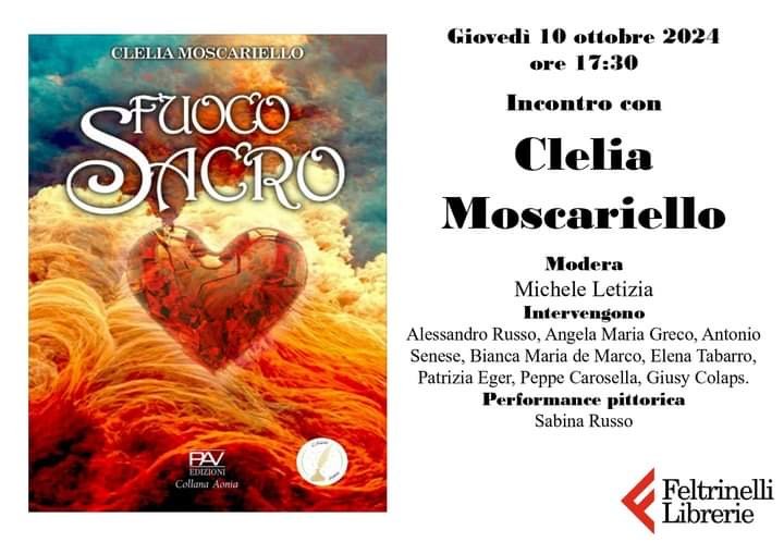 Infatti, giovedì 10 ottobre 2024, alle ore 17.30 circa sarà presentato l’ultimo libro di Clelia Moscariello, pubblicato da PAV Edizioni, dal titolo “FUOCO SACRO”, alla Libreria Feltrinelli di via dei Greci (nei paraggi di via Toledo) di Napoli.