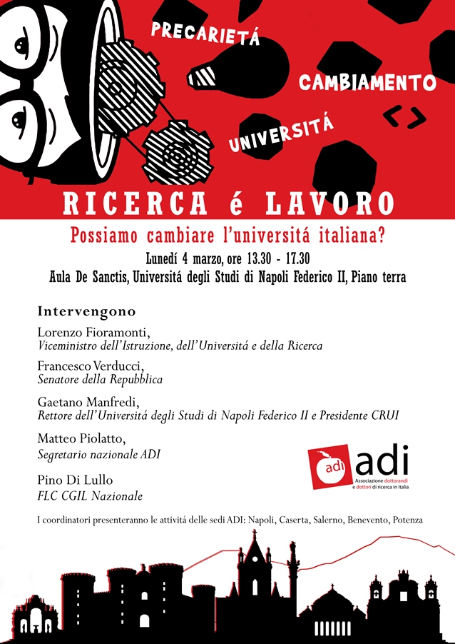 NAPOLI – Lunedì 4 marzo 2019, presso il Dipartimento di Giurisprudenza dell’Università degli Studi di Napoli Federico II, aula De Sanctis, si svolgerà l’incontro organizzato dall’ADI (Associazione Dottorandi e Dottori di Ricerca in Italia) dal titolo: “Ricerca è Lavoro. Possiamo cambiare l’università italiana?”. Interverranno Lorenzo Fioramonti (Viceministro dell’Istruzione, dell’Università e della Ricerca), Francesco Verducci (Senatore della Repubblica), Gaetano Manfredi (Rettore dell’Università degli Studi di Napoli Federico II e Presidente CRUI), Matteo Piolatto (Segretario nazionale ADI), Pino Di Lullo (FLC CGIL Nazionale).