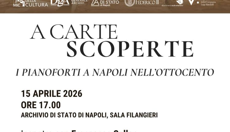 A carte scoperteMercoledì 15 aprile prossimo, alle 17, la sala Filangieri dell’Archivio di Stato di Napoli ospita l’incontro con Francesca Seller, I pianoforti a Napoli nell’Ottocento, per la rassegna A carte scoperte.