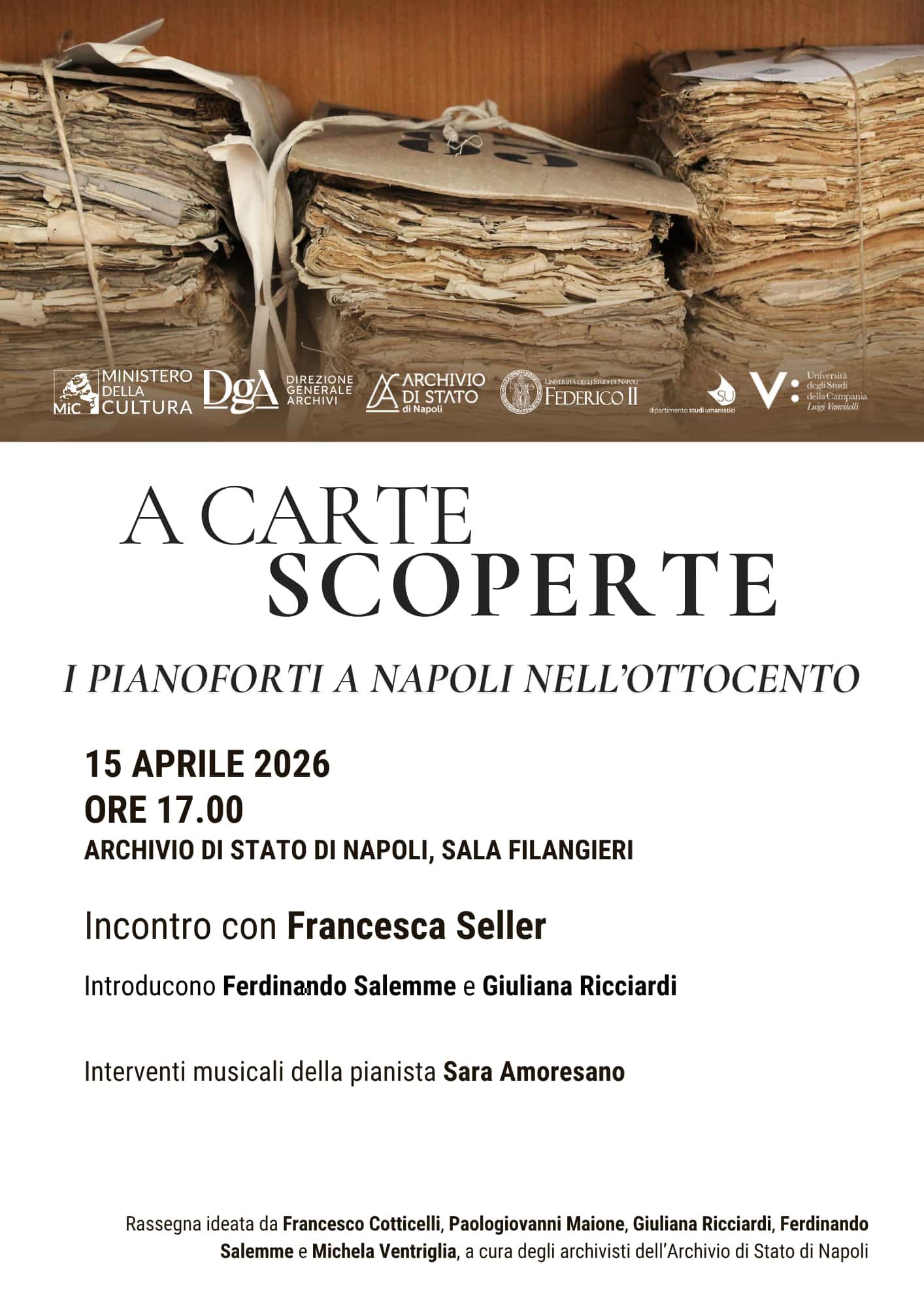 La rassegna A carte scoperte è realizzata con il contributo del Ministero della Cultura – Direzione generale Archivi, dell’Università degli studî di Napoli Federico II – Dipartimento di Studî umanistici e dell’Università degli studî della Campania Luigi Vanvitelli.