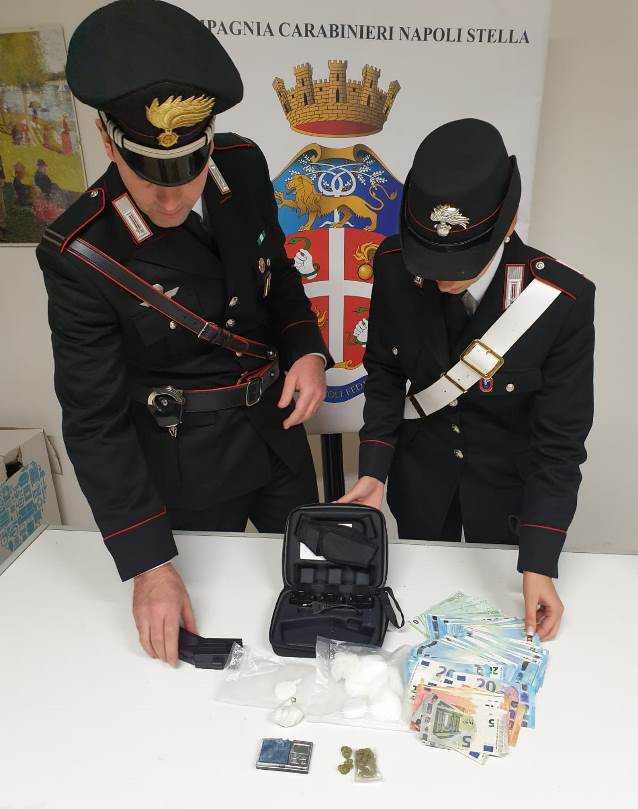 Nel vano contatore della sua abitazione i militari hanno rinvenuto e sequestrato 106 grammi di cocaina – ancora da tagliare – 2,2 grammi di marijuana e una stun gun (storditore). In una busta di cellophane anche 5450 euro in contante ritenuto provento illecito. Per lo stesso reato è stata arrestata anche Rita Cantalupo, 40enne del quartiere Avvocata già nota alle FF.OO.