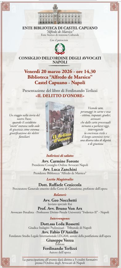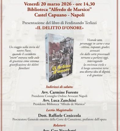 Venerdì 20 marzo 2026 alle ore 14.30, presso la Biblioteca “Alfredo De Marsico” di Castel Capuano a Napoli, sarà presentato il volume Il delitto d’onore del giornalista e scrittore Ferdinando Terlizzi, pubblicato da Giuseppe Vozza Editore.