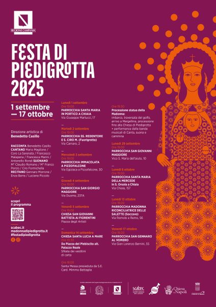 L’evento clou sarà il 14 settembre, quando Napoli renderà omaggio alla Madonna di Piedigrotta. La giornata di celebrazioni si aprirà alle ore 10.30 con la sfilata dei bambini nei tradizionali vestitini di carta da Piazza del Plebiscito. Alle ore 18.00, Santa Messa solenne presieduta da S.E. Card. Mimmo Battaglia, nella Chiesa di Santa Lucia a Mare. Infine, alle ore 19.30, la grande processione con la statua della Madonna, l’imbarco e la suggestiva traversata del golfo di Napoli fino a Mergellina – che si rinnova dopo un quarto di secolo –, con arrivo nella storica Chiesa di Santa Maria di Piedigrotta, cuore pulsante della Festa. Sarà prevista una performance con marce musicali e brani della tradizione classica napoletana eseguiti dalle bande dei giovani musicisti di Canta Suona e Cammina. La conferenza stampa ufficiale dell’evento, fissata per l’11 settembre a Napoli, ne svelerà ulteriori dettagli.