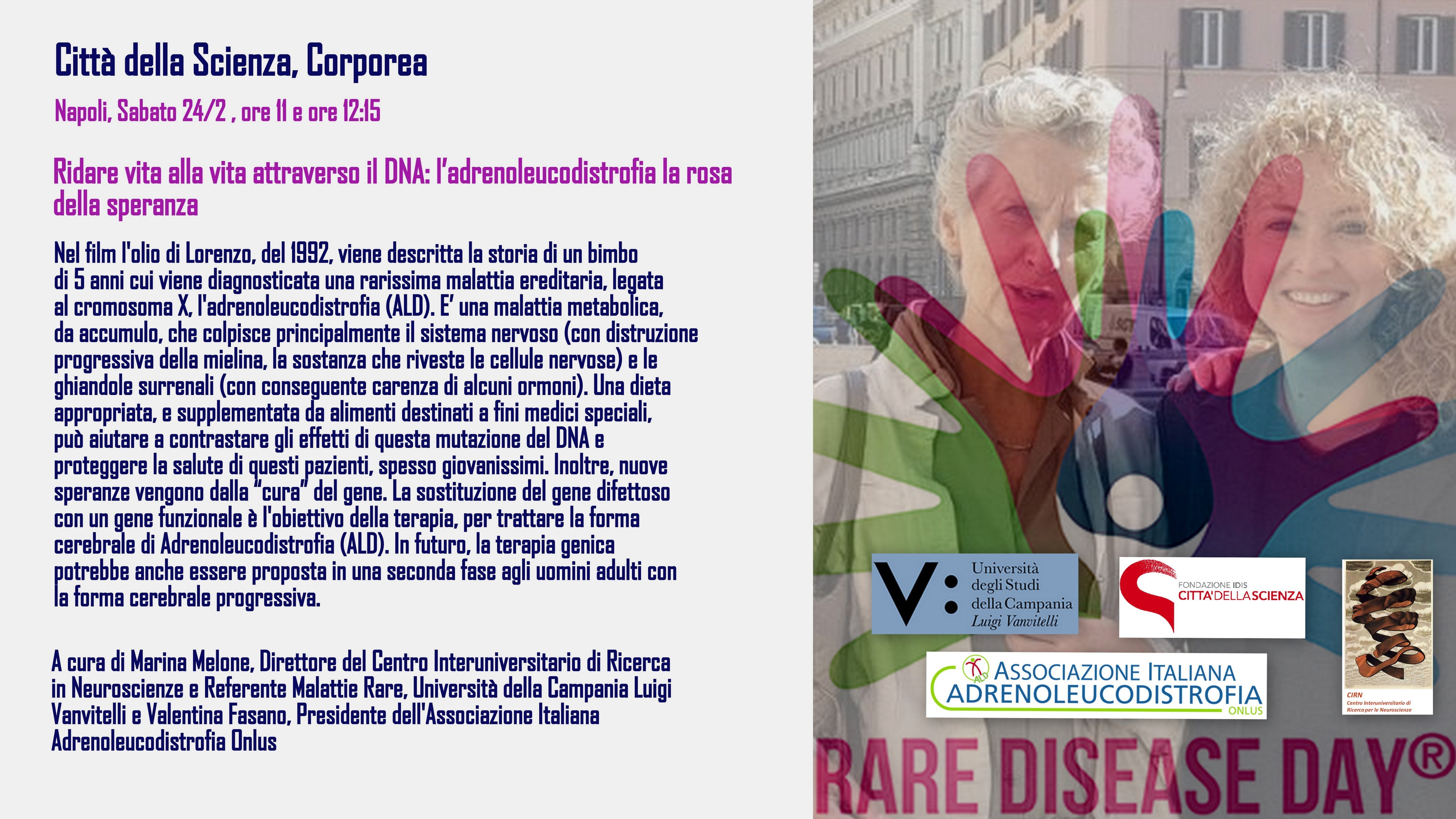 Sabato 24 febbraio, alle 11.00 e alle 12.15, a Città della Scienza, Corporea, focus sull’universo delle malattie rare con l’appuntamento “Ridare vita alla vita attraverso il DNA: l’Adrenoleucodistrofia la rosa della speranza”.