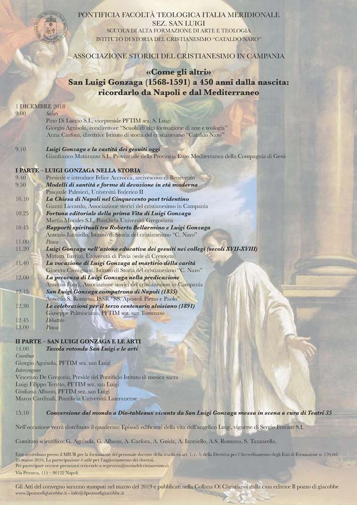 NAPOLI – Sarà il Convegno storico e artistico dedicato a Luigi Gonzaga “Come gli altri, San Luigi Gonzaga (1568-1591) a 450 anni dalla nascita: ricordarlo da Napoli e dal Mediterraneo” che si svolgerà sabato 1° dicembre 2018 a partire dalle ore 9.00 ad inaugurare ufficialmente la nuova Aula Magna da 350 posti, con la quale si completano i lavori di ristrutturazione che hanno interessato, per un triennio, la storica sede della Facoltà Teologica dell’Italia Meridionale intitolata a San Luigi Gonzaga e collocata a Napoli in via Petrarca e meglio nota come “Villa San Luigi” o “dei gesuiti a Posillipo”.