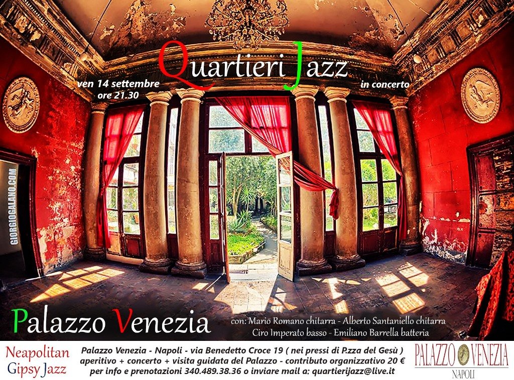 NAPOLI – Venerdì 14 Settembre 2018, alle ore 21.30, i “Quartieri Jazz” di Mario Romano si esibiranno nelle suggestive atmosfere di Palazzo Venezia in via Benedetto Croce, 19 Napoli (nei pressi di P.zza del Gesù)