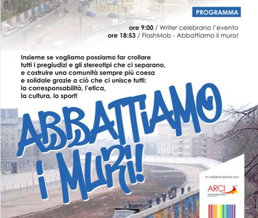 Nel pomeriggio ci sarà il cuore dell’evento con l’istallazione di un muro a secco creato dai partecipanti e poi “distrutto” alla 18:53, ora in cui è avvenuta la caduta del Muro di Berlino. La possibilità per ogni partecipante, di portare con se un mattone del muro, numerato e personalizzato, afferma: Alessandro Papaccio, componente della DN AICS: “l’evento tenta di affermare e rappresentare un momento di riflessione importante, sulle dinamiche, oggi, spesso di scontro, che i muri non hanno mai avuto nella storia un momento di gloria”, e forse sia il momento di costruire ponti più grandi e sostenibili”.