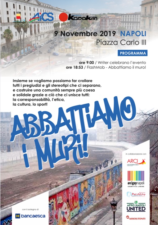 NAPOLI – Il 9 Novembre 2019 dalle ore 10,00 al centro di Piazza Carlo III si terrà la manifestazione “Abbattiamo i muri!”. La manifestazione celebrerà i 30 anni dalla caduta del Muro di Berlino. Parteciperanno all’evento persone provenienti da diversi background culturali accumunati dall’idea comune di difendere il senso di “comunità”. La giornata sarà articolata in più momenti. Alle 10 una plenaria accoglierà i partecipanti (WRITER) in cui gli artisti coloreranno la nostra giornata.
