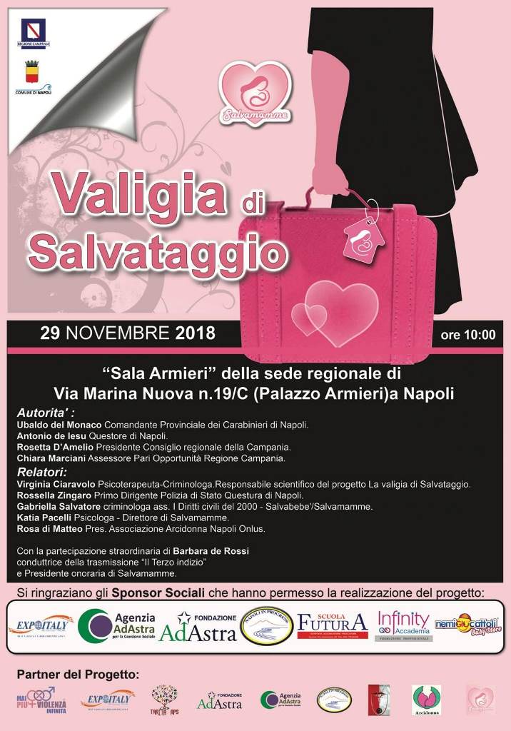 NAPOLI – Il 29 novembre 2018, a Napoli, nella sala Armieri, alle ore 10.00, si terrà la conferenza stampa per la presentazione del progetto ” La valigia di salvataggio” progetto rivolto a tutte le donne costrette a scappare all’improvviso, di fronte ad agiti aggressivi di partner maltrattanti creato dall’Associazione Salvamamme. L’idea progettuale è stata fortemente voluta dalla Regione Campania, che ha dato il Patrocinio Morale, nella figura dell’assessore alle Pari Opportunità Chiara Marciani, durante la conferenza stampa verrà presentata la Valigia nella sua complessità dall’ associazione che si occupa di fornire a queste donne una valigia contenente oggetti di prima necessità e giochi per i bambini, per rendere meno traumatizzante ed estranea la permanenza in una casa rifugio. Vista l’importanza del progetto è stato stilato un Protocollo d’Intesa con la Questura di Napoli, nella figura del dott. Antonio de Iesu. Alla conferenza stampa, per spiegare il tutto nel dettaglio, saranno presenti: la Presidente regionale Rosetta D’Amelio, il Comandante provinciale dei Carabinieri di Napoli Ubaldo del Monaco, la dirigente della Questura di Napoli Rossella Zingaro, la Responsabile tecnico scientifico del progetto Virginia Ciaravolo, Gabriella Salvatore e Katia Pacelli Salvamamme della sede nazionale di Roma, e Rosa di Matteo Arcidonna onlus Napoli. L’evento vedrà la straordinaria partecipazione dell’attrice Barbara de Rossi, Presidente onoraria e testimonial del progetto, e dei numerosi sponsor e partner campani che hanno permesso al progetto di poter muovere i primi passi su Napoli e di poter davvero combattere la violenza di genere, con concretezza per aiutare queste donne a non dover più tornare