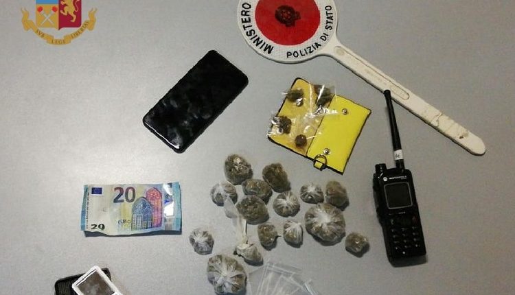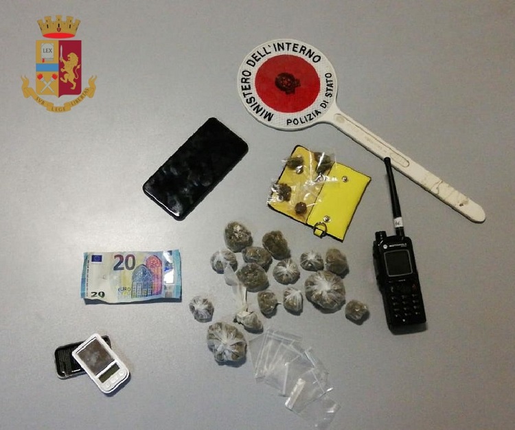 I poliziotti lo hanno raggiunto e bloccato in un appartamento dove hanno trovato un altro giovane ed hanno sequestrato uno zaino contenente diverse bustine di marijuana del peso complessivo di circa 30 grammi, un bilancino, un cellulare, la somma di 20 euro e diverso materiale per il confezionamento.