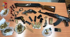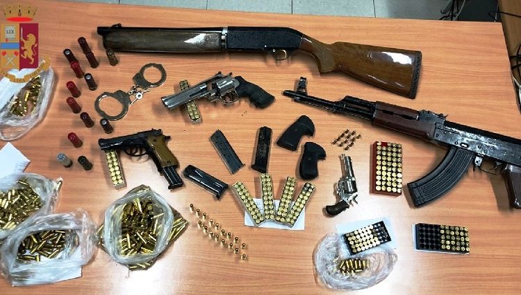 I poliziotti, giunti all’interno del locale, hanno praticato un foro in una delle pareti che era stata da poco imbiancata, ed hanno scoperto un’intercapedine dove erano stati occultati un fucile kalashnikov completo di caricatore, una pistola 44 Magnum, una pistola cal. 7,65 con matricola abrasa, un fucile cal. 12 a canne mozze, una pistola cal. 6,35, tre caricatori vuoti, un paio di manette e 738 cartucce di diverso calibro.