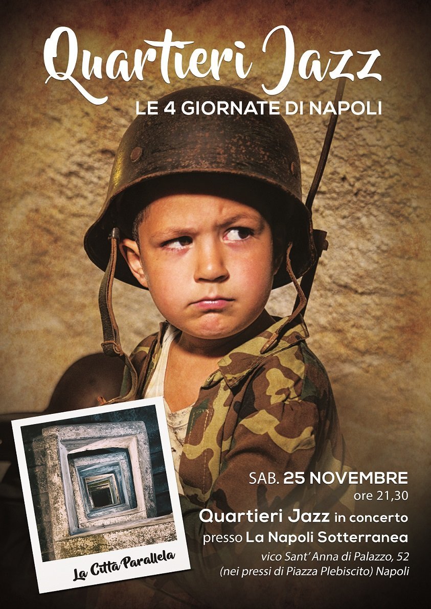 L’appuntamento è per sabato 25 Novembre alle 21.30 presso La Napoli Sotterranea (Vico Sant’Anna di Palazzo, 52), Quartieri Jazz in concerto con il loro secondo lavoro discografico dal titolo “Le 4 Giornate di Napoli”.