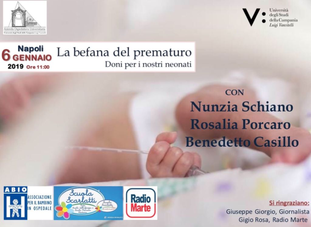 NAPOLI – Domenica 6 gennaio 2019 alle ore 11.00, gli attori Nunzia Schiano, Rosalia Porcaro e Benedetto Casillo, saranno i testimonial della “Befana del prematuro”, organizzata dall’AOU Vanvitelli, e faranno visita ai neonati del reparto della terapia intensiva neonatale in Largo Madonna delle Grazie a Napoli (1° policlinico), donando loro regali e dolciumi, sia ai piccoli assistiti che a genitori e parenti presenti. Saranno presenti all’evento, Giuseppe Paolisso, Rettore dell’Università Vanvitelli, Maurizio Di Mauro, Direttore Generale dell’AOU Vanvitelli, il Direttore del Dipartimento Materno Infantile, Emanuele Miraglia del Giudice, il Direttore della Clinica Ostetrica, Nicola Colacurci, la responsabile del reparto T.I.N., Teresa Vacchiano, il giornalista Giuseppe Giorgio, la direttrice della Scuola Scarlatti, Mariangela Marseglia (sempre sensibile alle problematiche legate al prematuro), il conduttore radiotelevisivo Gigio Rosa,