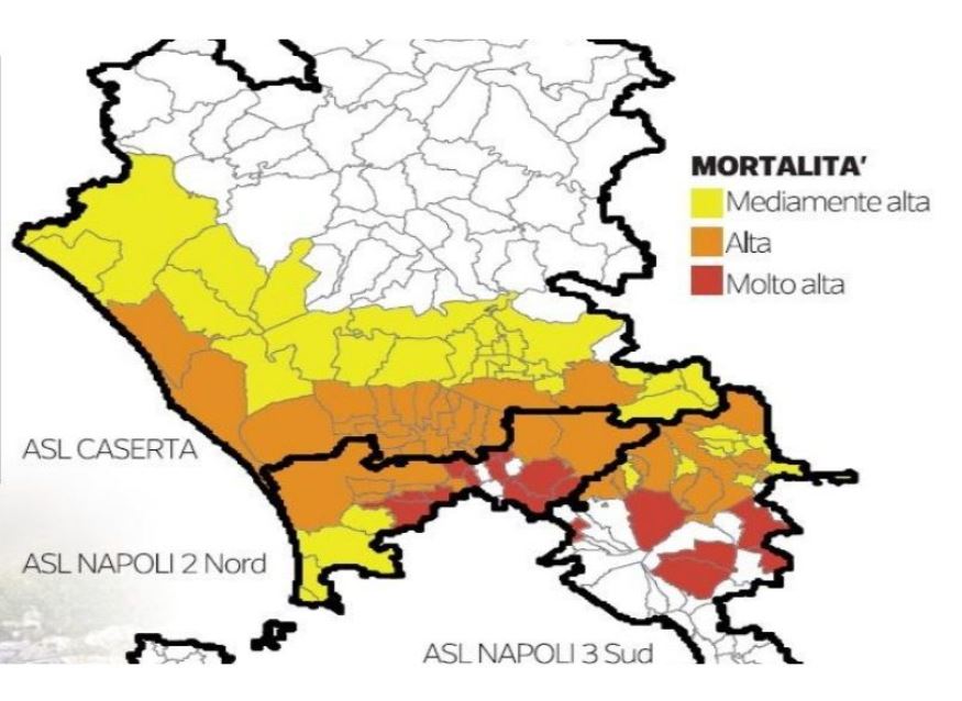 In particolare in Campania i cluster territoriali più esposti e con grande frequenza di mortalità, insiste in gran parte nei confini dell’Asl Na3sud dove le aree a ridosso del vesuviano che fanno capo a Somma Vesuviana, Palma Campania, Striano, San Giuseppe Vesuviano, Terzigno e un cluster tra Portici e San Giorgio a Cremano segnano dati allarmanti in tal senso. Praticamente sono le aree sovrapponibili agli ex SIN (siti di interesse nazionale) inquinati (oggi siti regionali per una scellerata decisione del Governo Monti complice la Giunta regionale dell’epoca) del Bacino del fiume Sarno, del Litorale vesuviano e Napoli est.