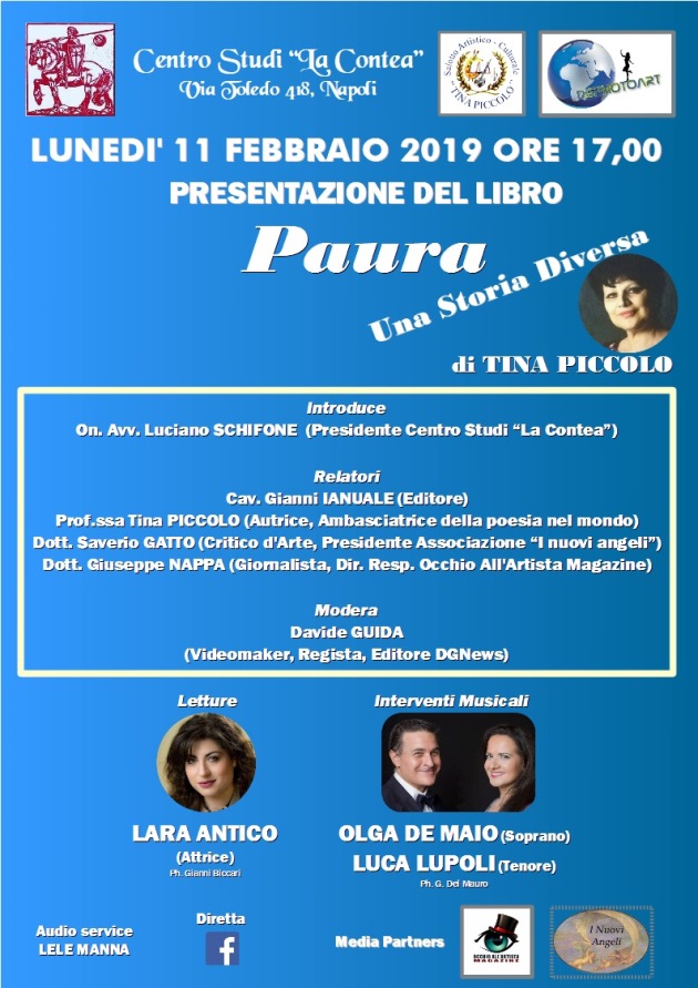 Il libro sarà presentato il prossimo lunedì 11 febbraio 2019 alle ore 17,00 al Centro Studi “La Contea”, a Napoli in via Toledo 418. Il presidente del Centro Studi, l’on. Avv. Luciano Schifone, introdurrà questo evento, organizzato dal regista e videomaker Davide Guida di DGPhotoArt (che sarà il moderatore della presentazione) in collaborazione col Circolo Artistico Culturale “Tina Piccolo”. Relatori saranno lo stesso Luciano Schifone, l’editore Gianni Ianuale, il Presidente della Associazione “I nuovi Angeli” Saverio Gatto, la autrice del libro Tina Piccolo, e il giornalista e presentatore Giuseppe Nappa, direttore responsabile della testata “Occhio all’Artista Magazine” che da anni conduce il salotto culturale storico della poetessa.