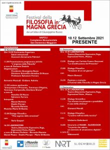 Napoli-Il Festival della filosofia in Magna Grecia, diretto dalla dott.ssa Giuseppina Russo, in collaborazione con l’Assessorato alla Cultura e al Turismo del Comune di Napoli, inaugura le proprie attività attraverso una rassegna di tre giorni (denominata “Presente”) ricca di eventi e personalità. Oggetto di interventi, rappresentazioni e laboratori sarà infatti un’analisi dei nostri giorni attraverso gli strumenti della filosofia e della scienza. Il 10 settembre dalle 10:30, dopo i saluti istituzionali, ci sarà una lezione spettacolo per leggere il presente attraverso le categorie di Giordano Bruno, Tommaso d’Aquino e Tommaso Campanella a cura dei membri del comitato scientifico prof. ssa Annalisa Nuzzo e prof. Salvatore Ferrara. Alle 15 sarà il momento della filosofa Ilaria Gaspari per discutere sui temi del suo ultimo libro Vita segreta delle emozioni, mentre alle 16:30 avranno inizio i laboratori. L’11 settembre, dalle ore 10:30, dopo i laboratori, sarà ospite del Festival lo scrittore Mauro Bonazzi autore del testo Creature di un sol giorno. Doppio appuntamento il 12 settembre, dopo i laboratori, alle ore 10:30, Giovanni Morelli discuterà di scienza e di metodo scientifico attraverso il testo La scienza tra presente e possibilità: il caso della chimica. Alle 13:15 sarà invece la volta di Umberto Galimberti che dialogherà e discuterà con i presenti sul destino dell’uomo nell’età della tecnica. Alle 16:00 è previsto l’ itinerario Mann-Slidedoor, la porta che unisce, un esercizio di umanesimo digitale.