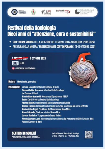 Il 6 ottobre alle ore 17, all’Auditorium San Domenico di Narni (Tr) è in programma la conferenza stampa di presentazione della X edizione del Festival della Sociologia e l’apertura della Mostra “Presenze d’arte contemporanea” organizzata da MinervArte (visitabile dal 3 al 12 ottobre).