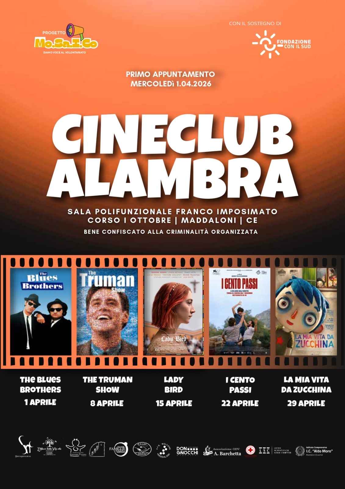 Il cineforum rientra nel progetto Mo.Sa.I.Co. – Momenti Salienti In Compagnia, sostenuto da Fondazione CON IL SUD, con SNC Libero Pensiero ODV come ente capofila e, tra i partner, l’associazione L’Albero della Vita.