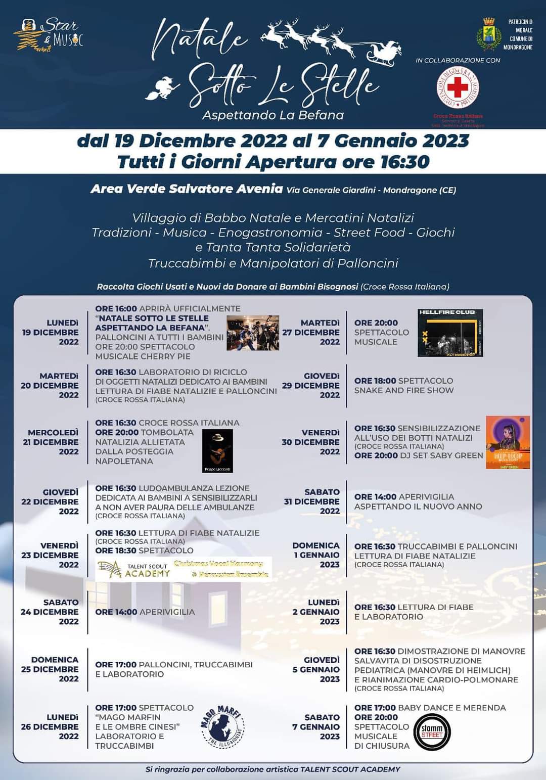 Dopo aver preso il via lo scorso 4 dicembre; al primo degli eventi in programma di “Natale a Mondragone” ha fatto seguito, così da accompagnarne i pomeriggi nel corso delle festività fino al prossimo 7 gennaio, l’intrattenimento dedicato ai bambini con l’iniziativa “Natale sotto le stelle. Aspettando la Befana”: tutti i giorni, dal 19 dicembre, a partire dalle ore 16,30 nell’area verde Salvatore Avenia – via Generale Giardini – presenti il Villaggio di Babbo Natale e i mercatini natalizi.