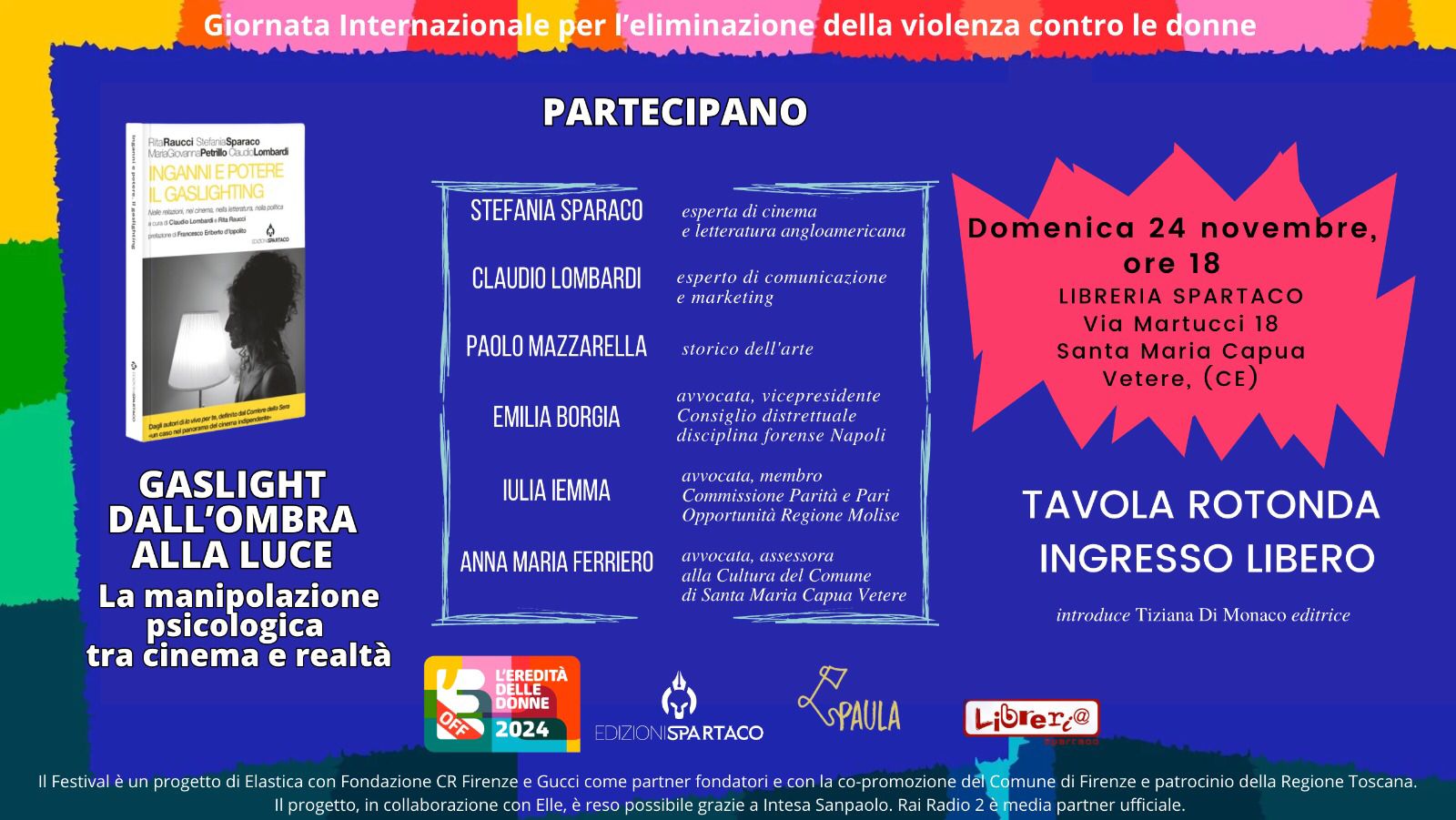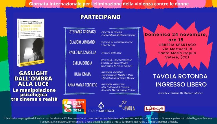 Giornata internazionale per l’eliminazione della violenza contro le donne. Evento nell’ambito del FESTIVAL L’EREDITÀ DELLE DONNE 2024 “GASLIGHT”, DALL’OMBRA ALLA LUCE, LA MANIPOLAZIONE PSICOLOGICA TRA CINEMA E REALTÀ. DOMENICA 24 NOVEMBRE – ORE 18: TAVOLA ROTONDA con EMILIA BORGIA – ANNA MARIA FERRIERO – IULIA IEMMA, CLAUDIO LOMBARDI – STEFANIA SPARACO – TIZIANA DI MONACO. Modera PAOLO MAZZARELLA. A 80 anni dall’uscita del film “Gaslight” (in Italia, “Angoscia”) di George Cukor, da cui il fenomeno trae il nome, le Edizioni Spartaco e il Collettivo Paula animano un confronto a più voci per comprendere le dinamiche del gaslighting, accrescerne la consapevolezza collettiva, illuminare il cammino delle vittime. Un’occasione per riflettere su una delle più raffinate e subdole forme di manipolazione psicologica, che si manifesta tanto nelle relazioni interpersonali quanto nel dibattito pubblico. Dopo i saluti dell’assessora alla Cultura di Santa Maria Capua Vetere, l’avvocata Anna Maria Ferriero, moderati dallo storico dell’arte Paolo Mazzarella, dialogheranno Emilia Borgia, avvocata e vice presidente del Consiglio distrettuale di disciplina forense di Napoli; Iulia Iemma, avvocata e componente della Commissione Parità e pari opportunità della Regione Molise; Claudio Lombardi, esperto di comunicazione e marketing, e Stefania Sparaco, esperta di cinema e letteratura anglo-americana, tra gli autori del saggio antologico “Inganni e potere. Il gaslighting” (Edizioni Spartaco); Tiziana Di Monaco, editrice. L’evento, che si aprirà sulle immagini dello short film “Io vivo per te”, fa parte del Calendario Off del Festival “L’eredità delle donne 2024” diretto da Serena Dandini. L’appuntamento è per domenica 24 novembre, alle ore 18, nella Libreria Spartaco, in via Martucci 18 a Santa Maria Capua Vetere.