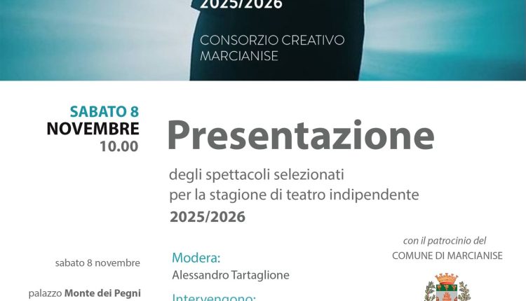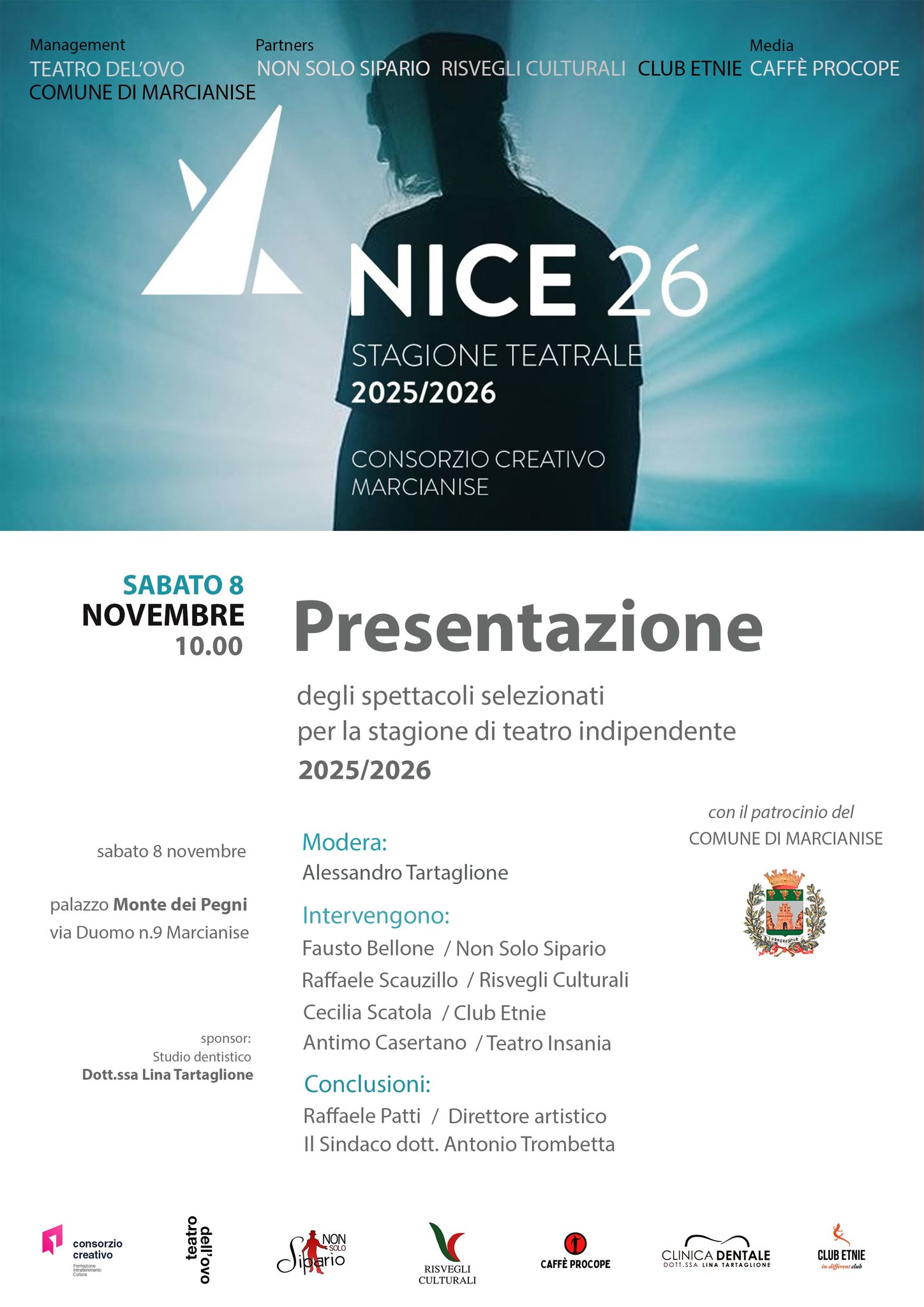 Si terrà sabato, 8 Novembre 2025, alle ore 10.00, la conferenza stampa di presentazione della nuova Stagione di Teatro Indipendente “NICE 26“, edizione 2025/2026. L’iniziativa promossa dal Consorzio Creativo di Marcianise, in collaborazione con Teatro dell’Ovo, Non Solo Sipario, Risvegli Culturali, Club Etnie e Caffé Procope, e con il patrocinio del Comune di Marcianise. Sponsor: Clinica Dentale Lina Tartaglione. L’evento si svolgerà presso il Palazzo Monte dei Pegni, in via Duomo n.9 a Marcianise.