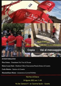 Caserta. Noi Voci di Donne, associazione di cui è Presidente Pina Farina ,  mercoledì 24 agosto 2022, alle ore 11:00 presso la sede operativa sita in Via san Gennaro 4 ex Caserma Sacchi presenterà il progetto “PORTE APERTE ALLA CITTA 2022’”, promosso dall’Ufficio Interdistrettuale di Esecuzione Penale Esterna – CAMPANIA – DIPARTIMENTO PER LA GIUSTIZIA MINORILE E DI COMUNITA’ .