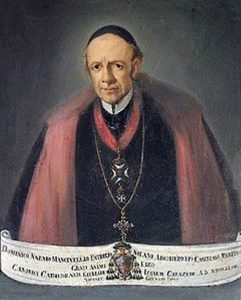 L’Arcivescovo Domenico Narni Mancinelli, nato a Nola il 29 marzo 1772 e morto a CASERTA il 17 aprile 1848, figlio del Conte Pasquale e di Donna Riccarda Cappello (nipote del Papa Clemente XII), laureato in Giurisprudenza, abbandonò le cure forensi ed abbracciò lo stato ecclesiastico, distinguendosi per pietà e dottrina; fu confessore dei francesi al tempo della loro dominazione in Napoli, predicatore attraente ed elegante, Maestro del Sacro Collegio di Teologia nell’Università di Napoli e canonico della Metropolitana di Napoli, fu da re Ferdinando I di Borbone eletto Arcivescovo di Cosenza, dove ebbe stima di Vescovo mansueto ma severo. Infaticabile visitatore di quei luoghi aspri e difficili. Designato il 5 dicembre 1831 dal re Ferdinando II e nominato il 24 Febbraio 1832 dalla Santa Sede alla Cattedra di Caserta, alla quale, per effetto del concordato del 1818 era stata unita quella di Caiazzo. Istituì nella cattedrale il collegio dei Mansionari e un orfanotrofio a Caserta ed un altro a Caiazzo dove consacrò l’altare maggiore delle Clarisse e fece costruire, a sue spese, le dietro stanze nella parte orientale del palazzo vescovile.