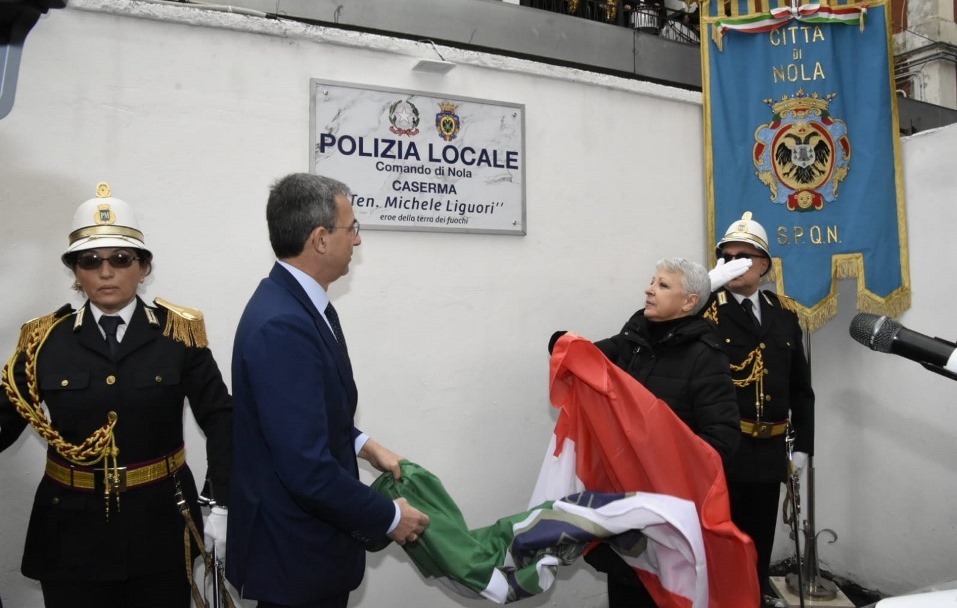 NOLA – Commovente cerimonia sabato mattina, 29 gennaio 2019, a Nola, dove è stata intitolata la sede della Polizia Locale al Tenente Michele LIGUORI della Polizia Locale di Acerra, scomparso il 19 gennaio 2014, dopo una grave malattia contratta in servizio. La cerimonia ha visto la presenza dei familiari, delle autorità civili, politiche, religiose e militari, ed è stata suggellata dalla presenza del Ministro dell’Ambiente e della Tutela del Territorio e del Mare, Sergio Costa.