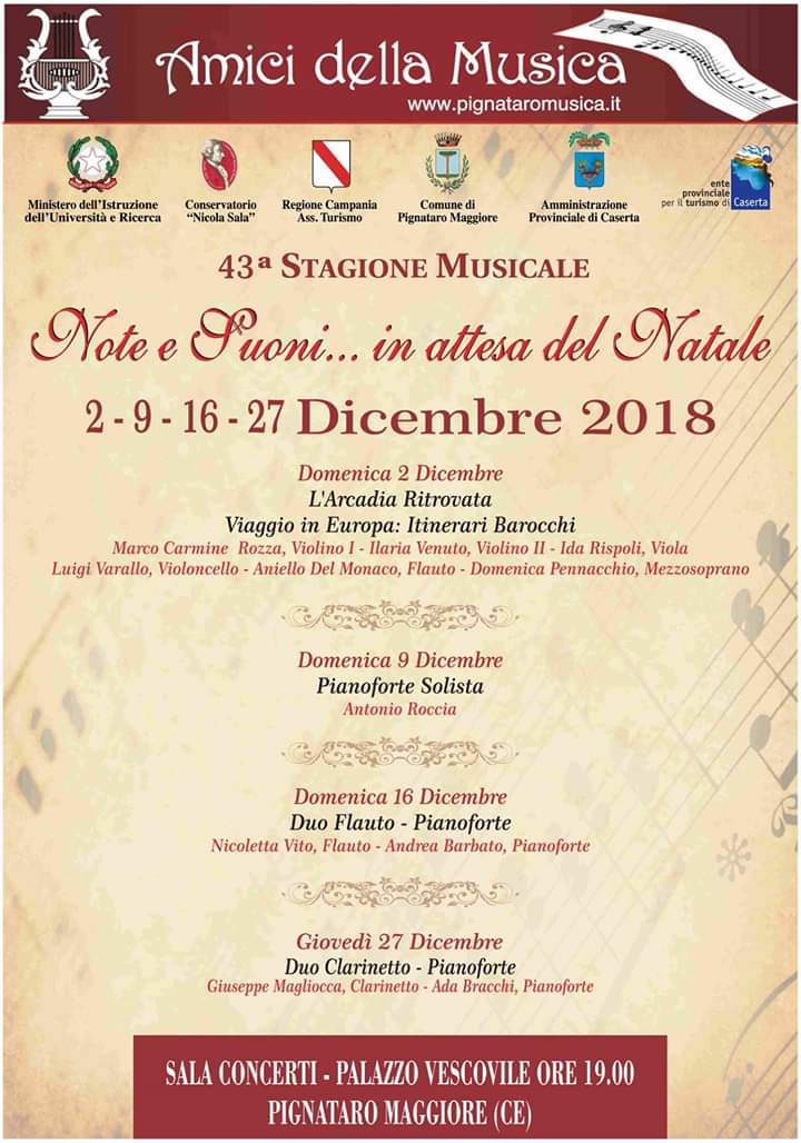 Note e Suoni..in attesa del Natale: appuntamenti artistici del mese di dicembre per gli “Amici della Musica di Pignataro Maggiore (Caserta). Il segmento concertistico che chiude lattività annuale del Sodalizio consta di quattro appuntamenti, previsti per il 2, 9, 16 e 27 dicembre, che si svolgeranno nella Sala Concerti del Palazzo Vescovile di Pignataro Maggiore alle ore 19.00, con ingresso libero e gratuito. Domenica 2 dicembre sarà di scena il Complesso Barocco di Caserta l’Arcadia Ritrovata, costituito da Marco Carmine Rozza, violino I; Ilaria Venuto, violino II; Ida Rispoli, viola; Luigi Varallo, violoncello; Aniello Del Monaco, flauto; Domenica Pennacchio, mezzosoprano. Viaggio in Europa: Itinerari Barocchi: un interessante excursus attraverso l’Europa musicale del Seicento e del Settecento.