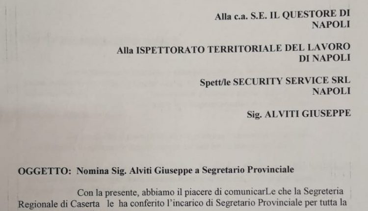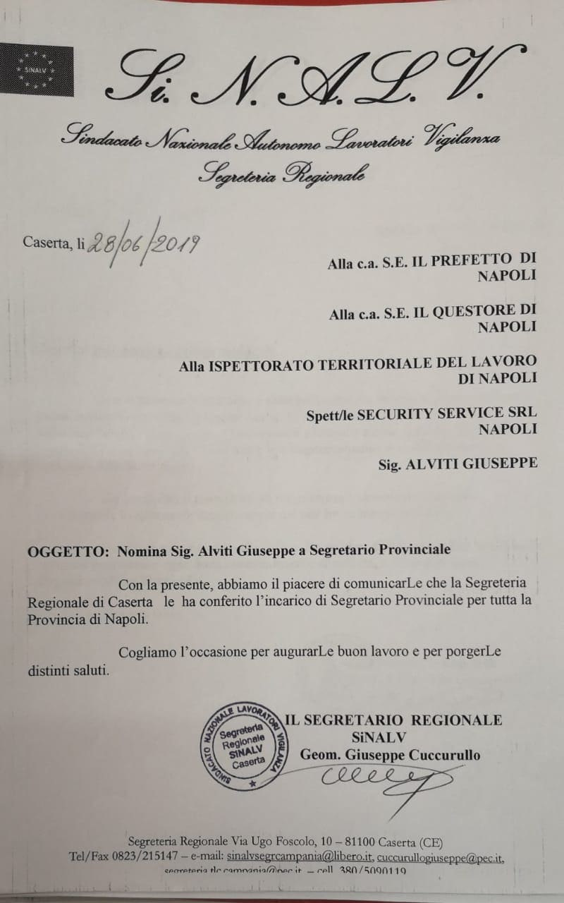 Nuove nomine all’interno dello SINALV, infatti è stato indicato Giuseppe Alviti, poi nominato Segretario Provinciale di Napoli dello Sinalv. È con viva soddisfazione che il segretario generale della Regione Campania del sindacato nazionale Lavoratori vigilanza privata ( Si.na.l.v.) Geom Giuseppe Cuccurullo ha nominato il noto sindacalista napoletano Giuseppe Alviti leader associazione guardie particolari giurate segretario Provinciale di Napoli. È da tempo riferisce Cuccurullo che ” premevo” acciocché Alviti accettasse l’ incarico, poiché per l’ intera categoria e in primis per la nostra sigla è una punta di diamante e sono sicuro che la nostra lotta contro le caste e i comitati di affari legati agli arroganti del potere avrà spunti di attenzione e anche di Vittoria. Primo impegno lo sciopero nazionale della vigilanza privata del 1 e 2 Agosto prossimo visto lo stallo che dal 2015 vede un Ccnl scaduto e mai rinnovato con proposte peggiorative da parte datoriale. Soddisfazione è stata espressa dal neo Segretario Provinciale Giuseppe Alviti che annoverera’ un un’altro incarico nel suo già ricco ” Palmares”.