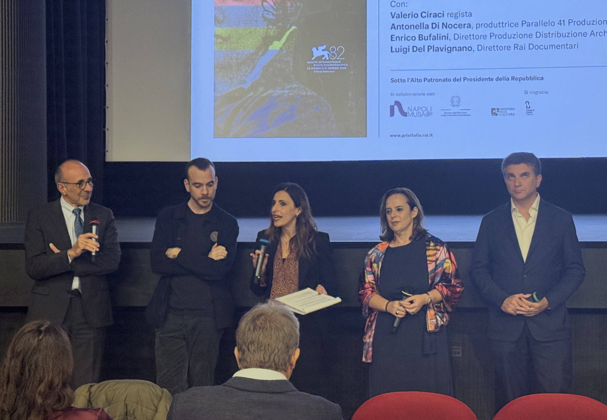 Continuano gli appuntamenti con i Documentari dedicati alla valorizzazione del personaggio della prima regista donna della Storia del Cinema Italiano durante il secolo breve. Il focus è incentrato soprattutto su “Elvira Notari: Oltre il Silenzio”, una coproduzione Italia-USA a cura di Parallelo 41, la società diretta da Antonella Di Nocera che coordina le molte iniziative in corso a Napoli. Il film, ha il sostegno di Cinecittà e la collaborazione di Cineteca Nazionale e Cineteca di Bologna. Dopo le numerose proiezioni in sala, in tutta la penisola, ecco approdare la straordinaria Notari al Prix Italia nella sezione Rai Documentari. Il regista Valerio Ciriaci, la produttrice Antonella Di Nocera, di Parallelo 41 Produzioni, Enrico Bufalini, Direttore Produzione Distribuzione Archivio Luce Cinecittà, Luigi Del Plavignano, Direttore Rai Documentari hanno aperto i lavori al cine-teatro America moderati dalla giornalista RAI Lara Martino. Si è discusso di come l’idea della promozione della Notari sia nata e di come si è giunti al termine del processo di programmazione del film nelle sale. Un prodotto di altissima qualità ben strutturato e raccontato dal regista Ciriaci insieme al montaggio di Francesca Sofia Allegra e Giovanni Pompetti. Quello che davvero colpisce nell’osservare con attenzione il prodotto filmico è tutta la parte riguardante i tessuti sonori. La colonna sonora principale è di Silvia Cignoli con la collaborazione di Michele Signore infatti nel film spiccano alcuni momenti musicali del compositore napoletano che da anni si occupa di sonorizzazioni per il cinema muto italiano, soprattutto per i film di Elvira Notari. In particolare, il brano “Nannì”, oltre a diventare un momento emblematico del film, accompagna i titoli di coda lasciado il pubblico agganciato alla storia e chiudendo il viaggio nel mondo di Elvira Notari con un’intensa emozione. In sala era presente il Silent Frame Ensemble, Umberto Maisto (chitarre e plettri), Anastasia Cecere (flauti), Simona Frasca (clarinetto) e Dolores Melodia (voce e fisarmonica), con il quale lo stesso Michele Signore sta già eseguendo, in giro per l’Italia, alcune colonne sonore originali scritte per i film di Elvira Notari. “Attualmente siamo impegnati nella registrazione della nuova colonna sonora che ho scritto per A Santanotte e che già stiamo eseguendo in giro per l’Italia”, afferma Signore. Varie atmosfere e paesaggi sonori misti ad armonie classiche della cultura Partenopea hanno accompagnato il racconto filmico di Ciriaci regalando davvero un’esperienza di rara bellezza ai fruitori presenti in sala. Un progetto che ha attraversato i cinema e i teatri più importanti presenti in Italia percorrendo la penisola da Sud a Nord. Sempre nuove evoluzioni nell’ambito produttivo per la squadra di musicisti ormai rodati su questo progetto cosi ambizioso e di gran valore artistico e culturale per la storia del cinema italiano. La crew di musici è sempre impegnata a scrivere e registrare nuovi prodotti musicali per la sonorizzazione della produzione cinematografica dedicata alla eclettica Notari. Alla guida sempre il compositore Michele Signore , della Nuova Compagnia di Canto Popolare, che in questi giorni stà entrando in studio di registrazione per la scrittura e l’incisione della Colonna Sonora di “A Santanotte” sempre della stessa Elvira Notari, sempre con gli stessi compagni di viaggio. Tutta questa operazione sarà supportata da Cineteca di Bologna e dal comitato costituito con il Mic per “I 150 anni di Elvira Coda Notari, la prima regista del cinema italiano” presieduto da Antonella Di Nocera. Attualmente ne fanno parte Riccardo Realfonzo, Gina Annunziata, Giuliana Bruno, Steve Della Casa, Gian Luca Farinelli, Titta Fiore, Simona Frasca, Cristina Jandelli, Anna Masecchia, Giuliana Muscio. Ancora nuove iniziative in cantiere e un nuovo progetto per la prossima estate 2026. Non ci resta che attendere la prossima proiezione. Un percorso artistico e culturale che continua a crescere, unendo memoria e innovazione, immagini e suoni, nel segno di una delle figure più affascinanti del cinema italiano ancora da scoprire. Soddisfazione per un’opera di successo e per un lavoro collettivo che, grazie allo sguardo di Valerio Ciriaci e alla ricchezza del paesaggio sonoro, restituisce voce e ritmo al silenzio di Elvira Notari.