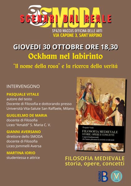 Sant’Arpino. Prosegue con un incontro denso di riflessione filosofica la rassegna “Scenari dal reale”, ospitata dallo Spazio Maccus Officina delle Arti (SMODA) di Sant’Arpino e in collaborazione con la testata giornalistica Belvederenews e il centro studi “Diderot” di Aversa. Giovedì 30 ottobre, alle ore 18:30, l’appuntamento dal titolo “Ockham nel labirinto. Il nome della rosa e la ricerca della verità” metterà al centro il pensiero del grande filosofo francescano inglese Guglielmo di Ockham, figura chiave della filosofia medievale e del nominalismo.