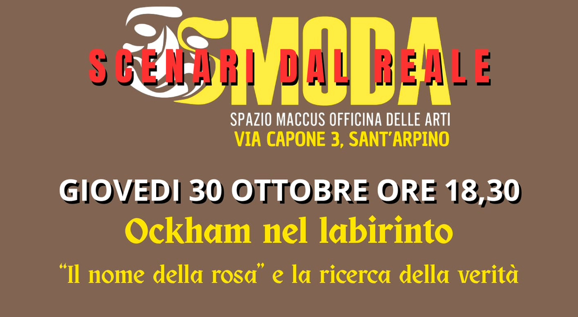 Sant’Arpino. Prosegue con un incontro denso di riflessione filosofica la rassegna “Scenari dal reale”, ospitata dallo Spazio Maccus Officina delle Arti (SMODA) di Sant’Arpino e in collaborazione con la testata giornalistica Belvederenews e il centro studi “Diderot” di Aversa. Giovedì 30 ottobre, alle ore 18:30, l’appuntamento dal titolo “Ockham nel labirinto. Il nome della rosa e la ricerca della verità” metterà al centro il pensiero del grande filosofo francescano inglese Guglielmo di Ockham, figura chiave della filosofia medievale e del nominalismo.