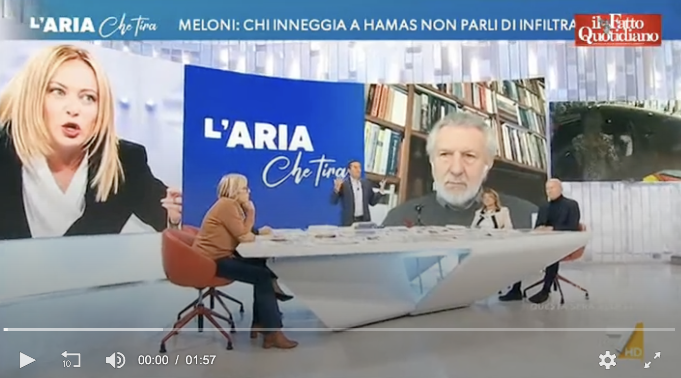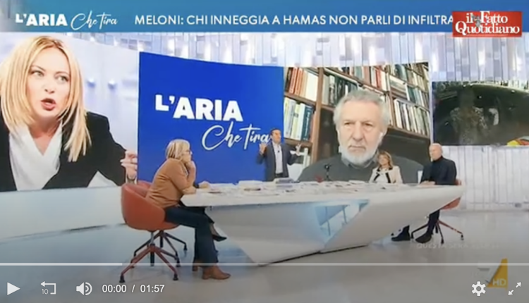 A L’aria che tira, programma di La7 oggi andato in scena l’ennesimo siparietto pro Israele: da un lato il matematico Piergiorgio Odifreddi e dall’altro Maria Teresa Meli, Mariatesa Loy ed il conduttore David Parenzo. L’argomento della contesa è stata l’interpretazione che Odifreddi ha dato agli eventi del 7 ottobre definendoli atti di resistenza (ad una situazione insostenibile, che perdura da prima del 1948 e più volte condannata dall’ONU!). In studio, chiaramente, si è scatenata l’indignazione e la discussione è diventata una sorta di uno (Odifreddi) contro tutti gli altri.