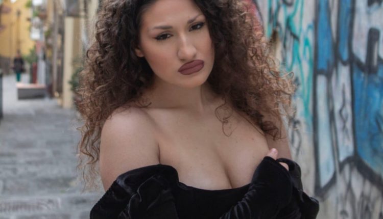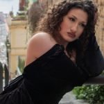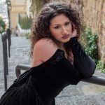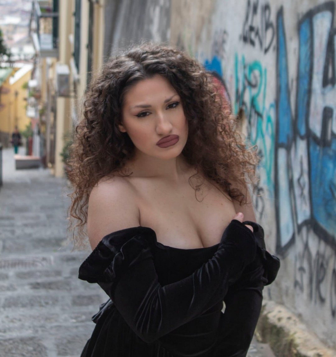 Avvolta in un elegante abito nero, Lucia incarna la sensualità e la forza della donna napoletana, una figura che da sempre porta con sé il mistero della notte e il calore del sole mediterraneo. Il gioco di luci e ombre esalta i suoi lineamenti, mentre l’ambientazione richiama l’anima antica e vibrante della città.