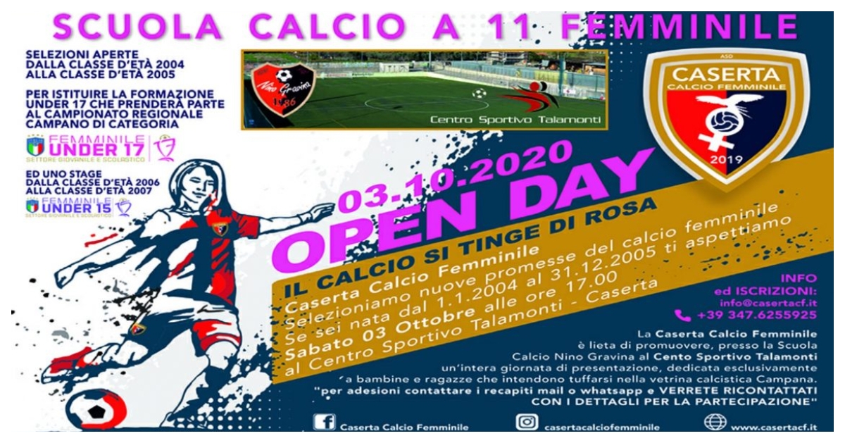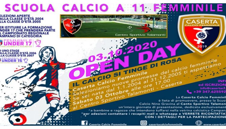 Individuare giovani promesse nel mondo del calcio femminile è dunque l’obiettivo dell’ Open Day, che vedrà la presentazione della Scuola Calcio della Caserta Calcio Femminile dalle ore 17.00, sabato 3 ottobre, presso la Scuola Calcio Nino Gravina al Centro Sportivo Talamonti.