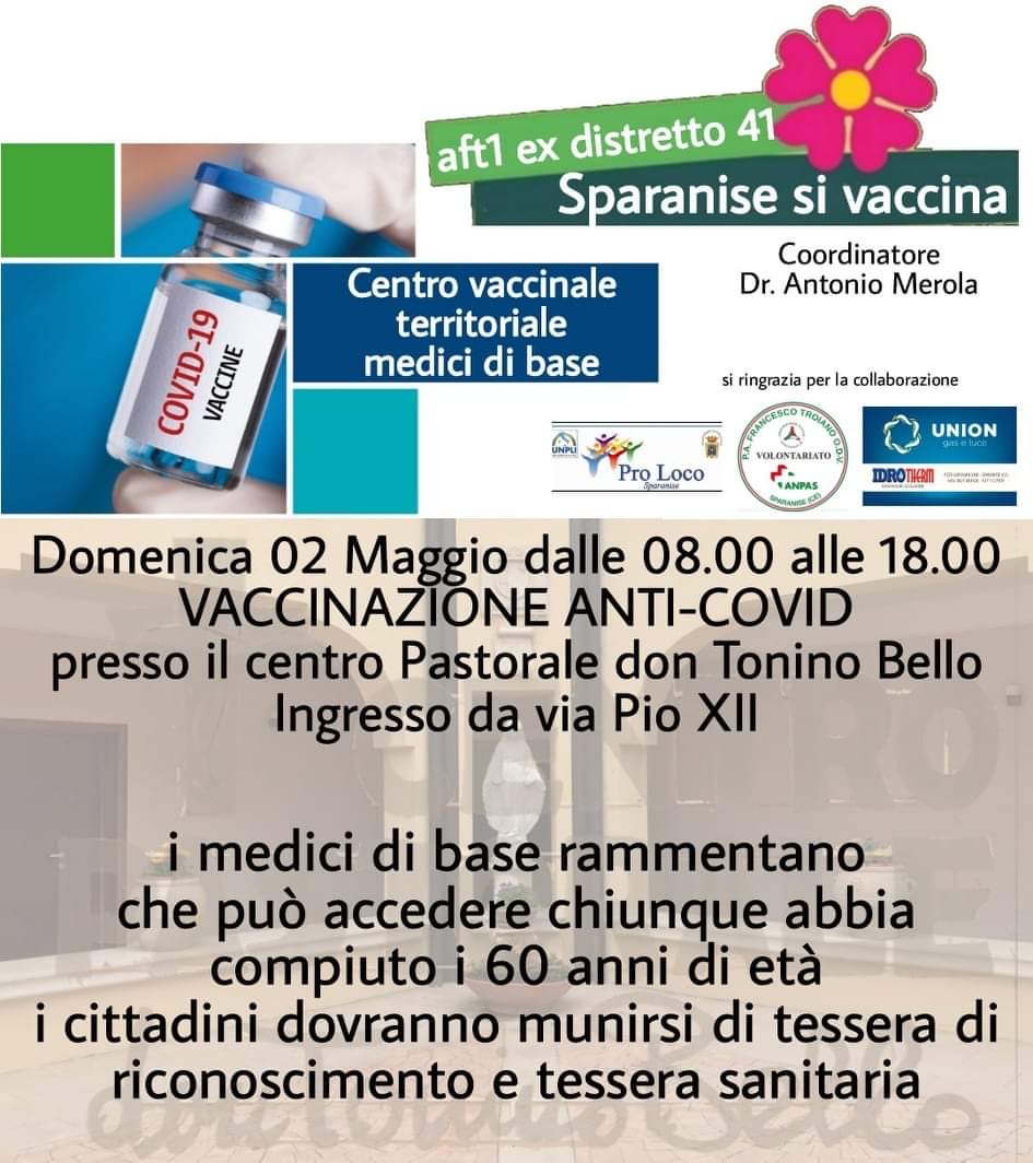 Domenica 02 Maggio 2021 dalle ore 08.00 alle ore 18.00 presso il centro Pastorale “don Tonino Bello” di Sparanise, parte, in provincia di Caserta, il primo centro vaccinale territoriale dei medici di base ex distretto 41 Capua, coordinato dal Dr. Antonio Merola.
