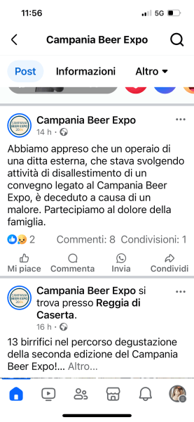 “Abbiamo appreso che un operaio di una ditta esterna, che stava svolgendo attività di disallestimento di un convegno legato al Campania Beer Expo, è deceduto a causa di un malore. Partecipiamo al dolore della famiglia”, si legge sulla pagina facebook ufficiale del Campania Beer Expo, evento iniziato ieri nei giardini della Flora, antistanti la Reggia.