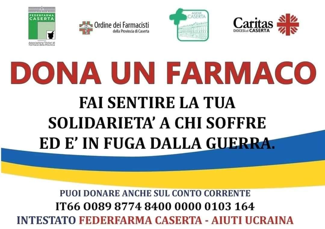 In collaborazione con Federfarma, l’ordine dei farmacisti di Caserta e la caritas diocesana vi invitiamo a partecipare a questa grande gara di solidarietà per il popolo ucraino. A tal proposito, dunque la Farmacia odierna Gadola si è fatta portavoce di questa iniziativa al quale chi vuole può dare il suo contributo.