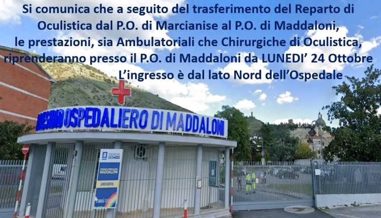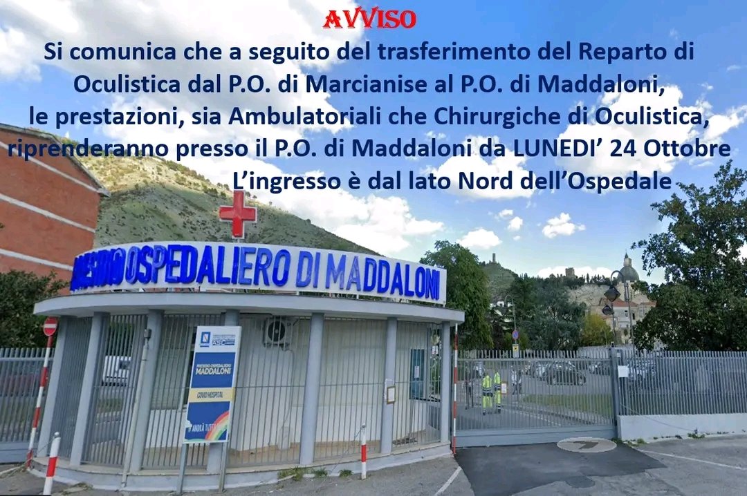 «Da lunedì 24 ottobre riprenderà a funzionare a pieno regime il reparto di oculistica dell’ospedale di Maddaloni. L’ospedale, quindi, ufficialmente, non sarà più solo un presidio Covid.