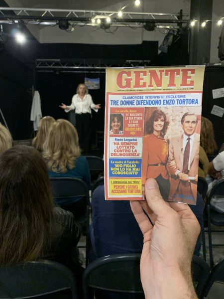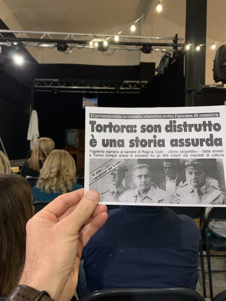 Ieri sera presso l’Officina Teatrale Generazione Libera (Caserta) è stato rappresentato lo spettacolo Big Ben ha detto stop! frase pronunciata dal Enzo Tortora quando, durante la trasmissione Portobello, annunciava la fine delle telefonate dal pubblico. Prima dello spettacolo Claudia Buono ha ricordato agli spettatori le attività di Generazione Libera che, attiva sul territorio dal 2011, si occupa di problematiche giovanili e aiuto alle fasce più deboli con attività culturali, doposcuola e teatro. Ha un centro polifunzionale a Tuoro (Caserta), dove è presente un piccolo teatro off, che offre una ricca stagione teatrale e settimanalmente laboratori teatrali. Inoltre all’interno del carcere di Carinola ha un laboratorio di panificati e pasticceria, denominato “I farinati”, che offre formazione e possibilità di lavoro ai denetuti. Al centro di Caserta ha una riciclofficina per la riparazione di biciclette, in cui è impiegato un ragazzo extracomunitario che offre un servizio alla comunità a prezzi popolari. Dopo il suo intervento ha avuto inizio lo spettacolo di Nicola Maiello, con Giovanni Allocca, regia di Massimo di Matteo, che si pone il proposito di ricostruire dal basso la triste e paradossale vicenda giudiziaria di Enzo Tortora. All’ingresso del teatro lo spettatore è accolto da una macchina da scrivere ricolma di intagli di giornale (Corriere della sera, Gente, Gazzetta dello sport), appoggiati anche sulle poltrone, che annunciavano l’arresto del celeberrimo conduttore televisivo. Sul palco una televisione da riparare, un fornello per preparare il caffè e sullo sfondo un dipinto ad acquarello suggeriscono allo spettatore di trovarsi a Genova alla fine anni ‘80. Dalle quinte appare un radiotecnico (il bravo Giovanni Allocca, che è riuscito a tenere la scena da solo per ben 70 minuti) che, amico di infanzia del presentatore Enzo Tortora, decide di ricostruirne la storia e la vicenda giudiziaria. Attraverso il suo filtro sono ripercorsi gli eventi più controversi del dopoguerra italiano e soprattutto dell’avvento della televisione. Un intenso odore di caffè avvolge la sala, l’attore scende dal palco per offrirne una tazza agli spettatori ai quali pone la domanda spiazzante “e voi ci avete creduto?”. L’ordinarietà e la serenità si incrina e lascia così spazio alla narrazione di eventi che hanno dell’incredibile. In questo preciso istante la mente immagina lo stato d’animo di Enzo Tortora che, da una situazione di assoluta normalità, si vede proiettato in una bolgia infernale. Tutto ha inizio negli anni ‘50 , gli spettatori sono allietati dalla dolce melodia di “Aprite le finestre” di Franca Raimondi, che dopo gli anni della guerra sembra ricordare a tutti il diritto di restare bambini il più a lungo possibile. Tortora e il suo amico radiotecnico hanno conosciuto “il ferro dei proiettili e delle bombe” che piovevano dal cielo, ma dopo tanto calvario Tortora riesce nell’impresa di diventare presentatore televisivo. Il protagonista in scena ricorda lo stupore di averlo visto in Tv, con la giacca color verde pisello, a presentare un concorso di bellezza, con Silvana Pampanini. Erano quelli anni in cui si aveva fame di normalità, quiete e voglia  di distrarsi anche attraverso il ciclismo. La televisore diviene una nuova religione e presto segna limite tra persone comuni e personaggi. Attraverso un salto temporale si giunge poi agli anni ‘70 , Tortora è critico nei confronti del servizio pubblico e così inizia il suo esilio nelle televisioni private, da Tele Biella ad Antenna 3, che dava voce alle persone comuni. È questo il periodo in cui si montano antenne ovunque e lo spettatore si ritrova nuovamente di fronte all’immagine del ferro (da quello caduto delle bombe a quello lanciato per piantare antenne). Dopo otto anni di esilio nelle reti private e locali, Tortora ritorna sulle reti nazionali con “Portobello”, ma durante il momento più alto del suo successo è letteralmente “strappato dal suo letto” ed è arrestato  per camorra e traffico di droga (dal ferro caduto e a quello lanciato si passa a quello freddo e vergognoso delle manette) Quest’evento era stato presagito da un’agenzia dell’Ansa a cui Tortora aveva replicato con l’ironia che lo caratterizzava: