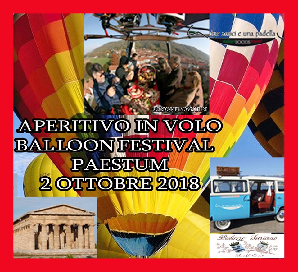 PAESTUM – Arrenditi alla volontà del vento, lasciati alle spalle tutto, rinuncia al controllo…vieni fino a Domenica 7 ottobre 2018 a Paestum dove si terrà l’evento più atteso di fine estate: il Festival delle Mongolfiere. Trenta palloni multicolore, provenienti da tutt’Europa, danno spettacolo con i decolli ai piedi dei Templi greco-romanici. Ma la notizia più interessante, più curiosa e più golosa è che il 2 ottobre Due amici ed una Padella proporranno a bordo della mongolfiera un AperiBalloon. “Due Amici ed una Padella” in arte, nella vita Maria Giovanna Santucci ed Alfredo Di Domenico, amici praticamente da sempre, e la “padella” oltre che lo strumento del secondo, cuoco per passione, anche il contenitore dove salta, con allegria, la loro lunga amicizia. “Salta”, ovviamente in gergo culinario. Perché Maria Giovanna e Alfredo, come ai tempi della scuola, organizzano eventi divertenti, gustosi e, allo stesso tempo, salutari, mantenendo sempre alta la qualità degli ingredienti e basse le calorie (ove è possibile, naturalmente). L’appuntamento è alle ore 16,30 di Martedì 2 Ottobre 2018, e per essere certi che ci possa essere un posto anche per voi, è consigliabile visitare, per prenotare, la loro pagina ufficiale Facebook “Due amici e una padella”, oppure cellulare 3314640205.