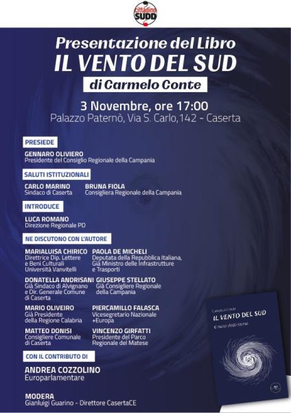 La presentazione, organizzata dall’associazione “Cittadino Sudd”, sarà aperta dal presidente del Consiglio Regionale della Campania, Gennaro Oliviero, da Carlo Marino, sindaco di Caserta, e Bruna Fiola, consigliera regionale.