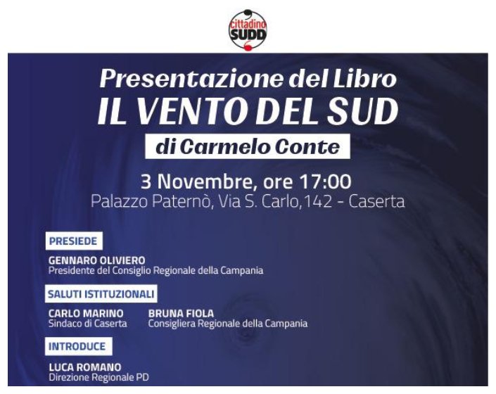 Dopo l’introduzione di Luca Romano, della direzione regionale del Pd, discuteranno con l’autore del libro: MariaLuisa Chirico, direttrice del Dipartimento di Lettere dell’Università Vanvitelli, Paola De Micheli, ex deputata Pd, Donatella Andrisani, direttore generale del Comune di Caserta, Giuseppe Stellato, ex consigliere regionale della Campania, Mario Oliveiro, ex presidente Regione Calabria, Piercamillo Falasca, vicesegretario nazionale +Europa, Matteo Donisi, consigliere comunale di Caserta, Vincenzo Girfatti, presidente del Parco regionale del Matese.