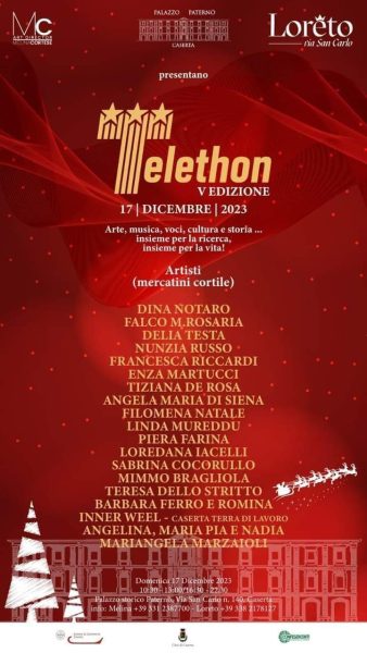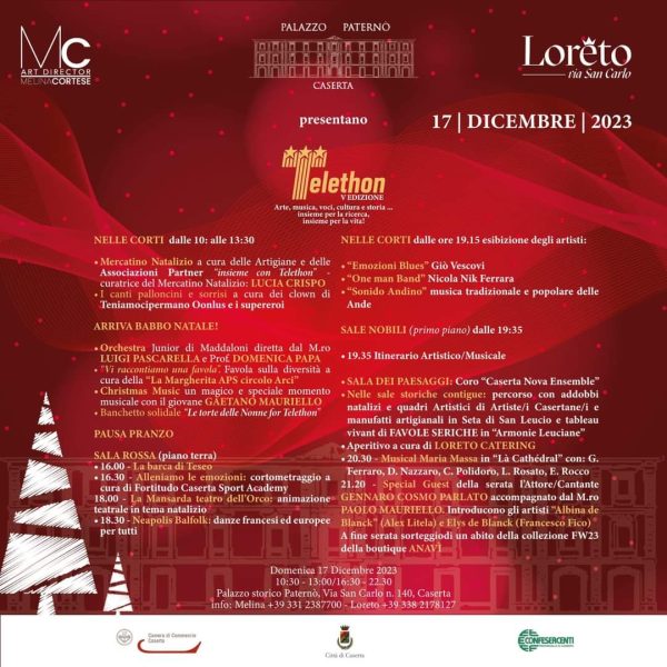 Nella suggestiva location rappresentata dallo storico Palazzo Paternò sito in Via San Carlo n° 140 – Caserta, si terrà, domenica 17 dicembre, la quinta edizione dell’evento piú atteso: la raccolta fondi di Telethon alla quale la Città di Caserta- la manifestazione ha ottenuto il patrocinio del Comune, della Camera di Commercio, della Confesercenti e della Fondazione Telethon– si sta preparando con entusiasmo in vista di un appuntamento così importante, ormai alle porte.