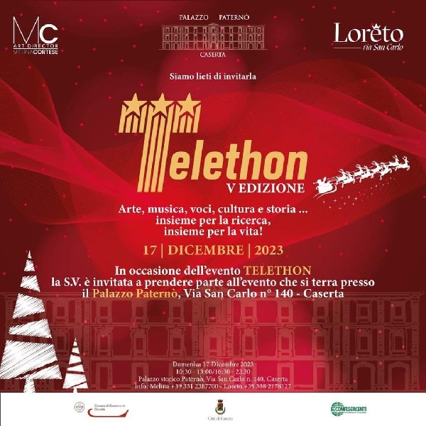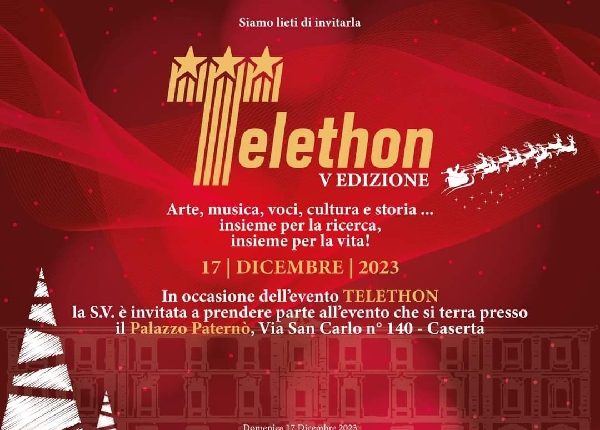 Nella suggestiva location rappresentata dallo storico Palazzo Paternò sito in Via San Carlo n° 140 – Caserta, si terrà, domenica 17 dicembre, la quinta edizione dell’evento piú atteso: la raccolta fondi di Telethon alla quale la Città di Caserta- la manifestazione ha ottenuto il patrocinio del Comune, della Camera di Commercio, della Confesercenti e della Fondazione Telethon– si sta preparando con entusiasmo in vista di un appuntamento così importante, ormai alle porte.