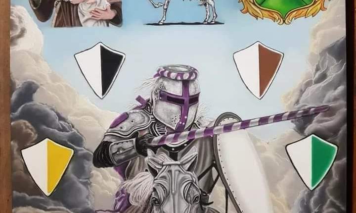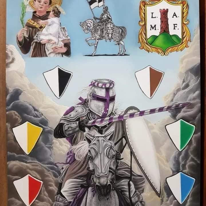 Un’ opera in cui si intrecciano abilmente maestria e passione, e che ci presenta un cavaliere attorniato dai simboli delle contrade roccane con in alto l’effige di Sant’Antonio da Padova e lo stemma del Comune di Roccamonfina.
