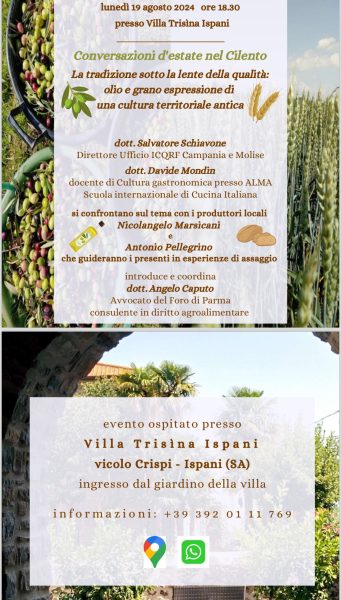 Ispani – Lunedì 19 agosto, a villa Trisìna a Ispani, nel cuore del Cilento, torna, dopo il successo dello scorso anno, l’appuntamento annuale per discutere sulle tradizioni enogastronomiche cilentane. “Conversazioni d’estate nel Cilento” è un evento dal taglio divulgativo formativo, in cui, esperti del settore, approfondiscono, con scienza e competenza, il vero significato delle tipicità e delle tradizioni, sfatando anche tanti luoghi comuni che negli ultimi anni si stanno diffondendo in merito a questo settore.