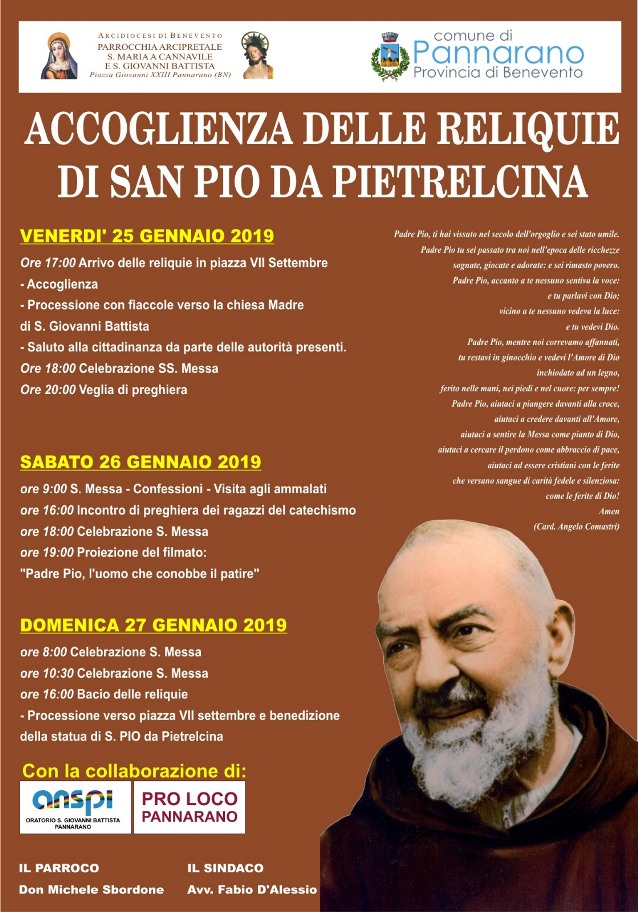 PANNARANO (BN) – Un fine settimana importante per la comunità che ospiterà da venerdì, 25 gennaio 2019, a domenica 27 gennaio 2019, le Reliquie del Santo Padre di Pietrelcina. L’iniziativa in preparazione da diversi mesi, ha incontrato il benestare e il vivo entusiasmo delle autorità religiose e politiche, con l’intento unico di portare amore e serenità in un contesto di fratellanza e di unione nella preghiera. Il pellegrinaggio è coordinato dall’associazione internazionale “Amici di Padre Pio”, col direttore Gianni Mozzillo. Le reliquie di Padre Pio, giungeranno oggi alle 17:00 in Piazza VII settembre. Saranno due giorni intensi di preghiera e devozione per la comunità tutta e per i tanti fedeli di Padre Pio. Il parroco Don Michele Sbordone celebrerà la santa messa, unitamente al confratello di Padre Pio, Frate Riccardo Fabiano, che è il custode ufficiale delle Sante Reliquie.